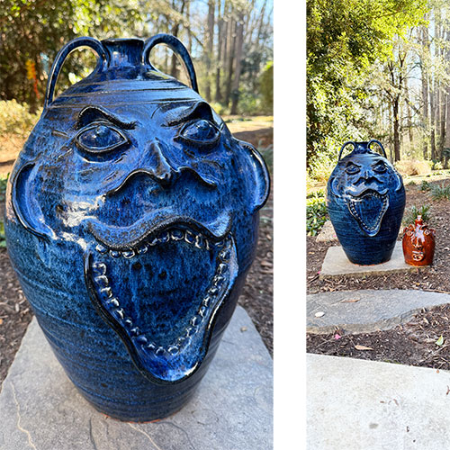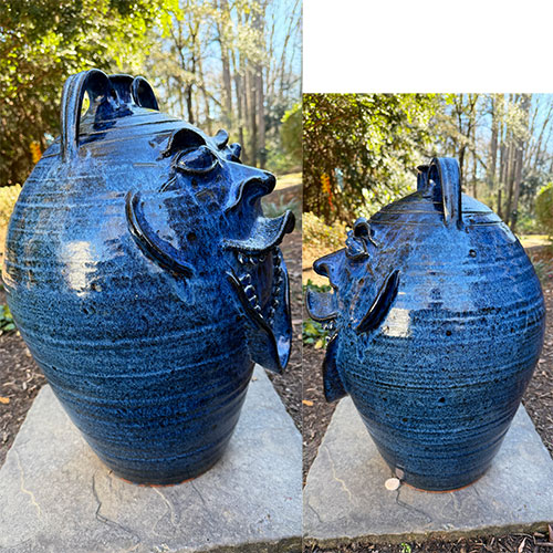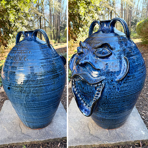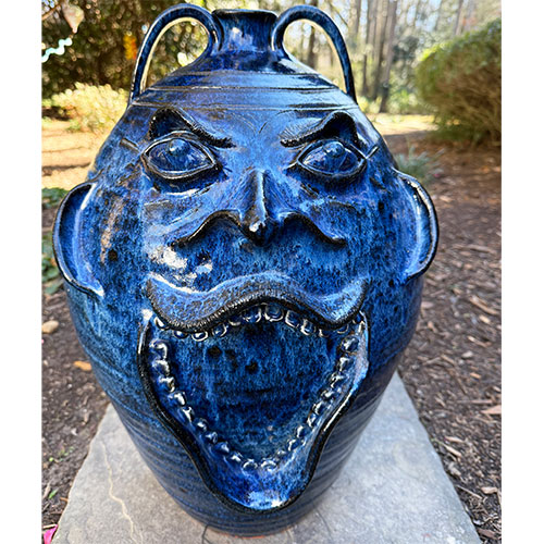 He’s created a certain look to his face jugs that is immediately recognizable. The well defined nose with flaring nostrils, white bulging eyes with cobalt pupils and the large gaping mouth with two rows of individually crafted white teeth that are part of Steve’s trademark look. Steve is well known for his beautiful swirl pieces using the swirl technique that’s such an important part of historic Catawba Valley pottery.