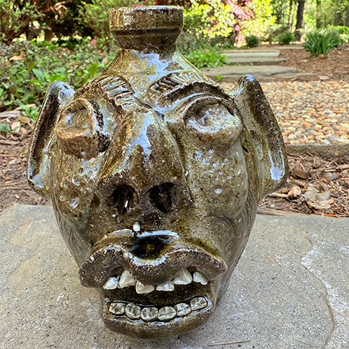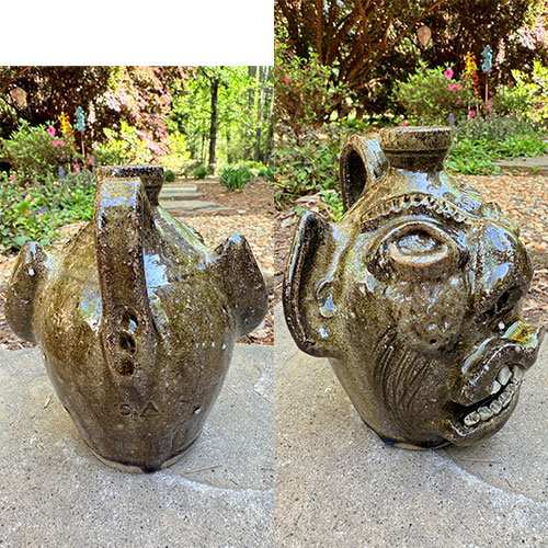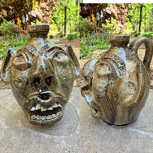 He’s created a certain look to his face jugs that is immediately recognizable. The well defined nose with flaring nostrils, white bulging eyes with cobalt pupils and the large gaping mouth with two rows of individually crafted white teeth that are part of Steve’s trademark look. Steve is well known for his beautiful swirl pieces using the swirl technique that’s such an important part of historic Catawba Valley pottery.