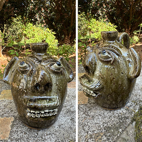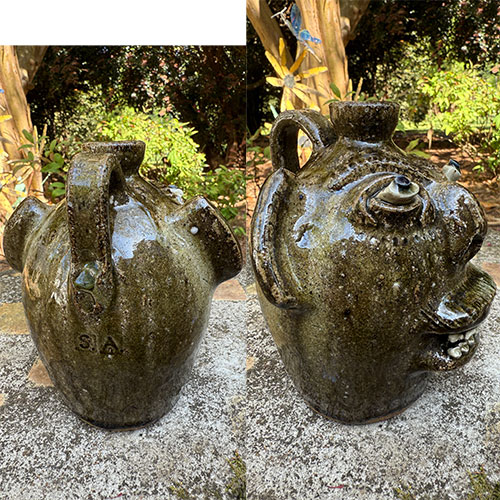 He’s created a certain look to his face jugs that is immediately recognizable. The well defined nose with flaring nostrils, white bulging eyes with cobalt pupils and the large gaping mouth with two rows of individually crafted white teeth that are part of Steve’s trademark look. Steve is well known for his beautiful swirl pieces using the swirl technique that’s such an important part of historic Catawba Valley pottery.