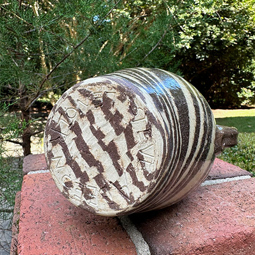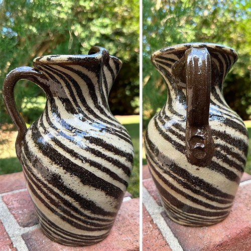 He’s created a certain look to his face jugs that is immediately recognizable. The well defined nose with flaring nostrils, white bulging eyes with cobalt pupils and the large gaping mouth with two rows of individually crafted white teeth that are part of Steve’s trademark look. Steve is well known for his beautiful swirl pieces using the swirl technique that’s such an important part of historic Catawba Valley pottery.