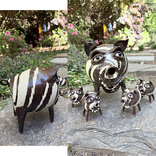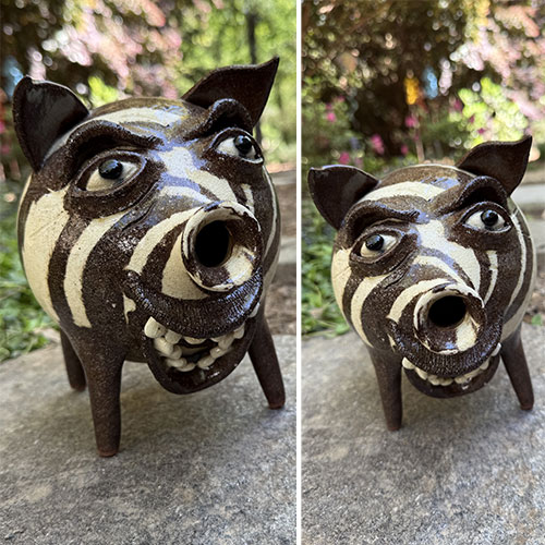 He’s created a certain look to his face jugs that is immediately recognizable. The well defined nose with flaring nostrils, white bulging eyes with cobalt pupils and the large gaping mouth with two rows of individually crafted white teeth that are part of Steve’s trademark look. Steve is well known for his beautiful swirl pieces using the swirl technique that’s such an important part of historic Catawba Valley pottery.