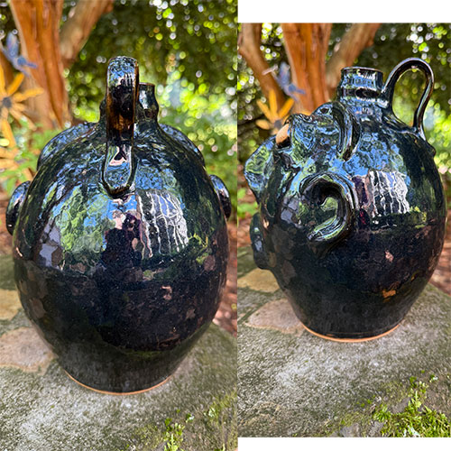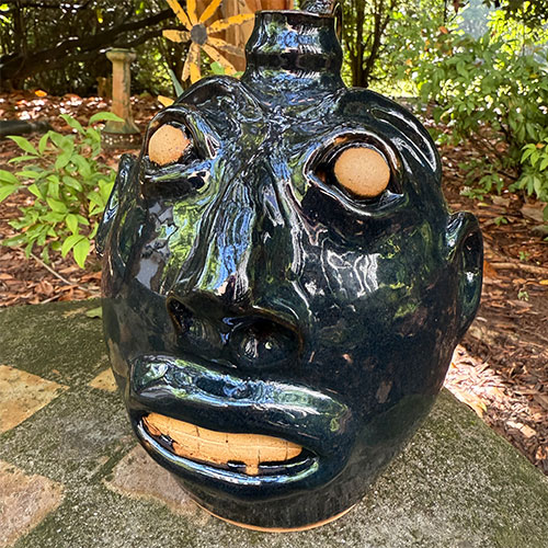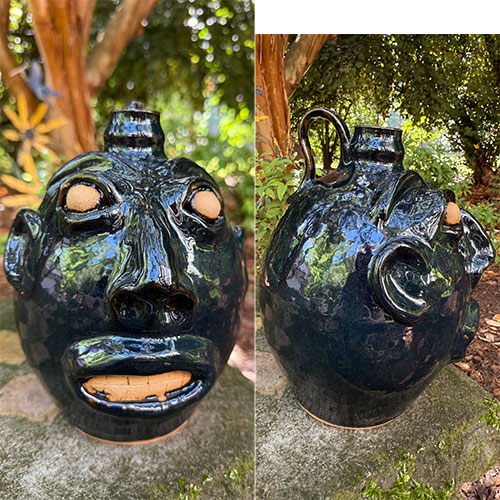 This face jug is created in the Edgefield style. It is 10" tall with a 4" base.