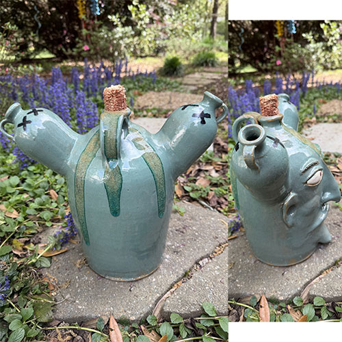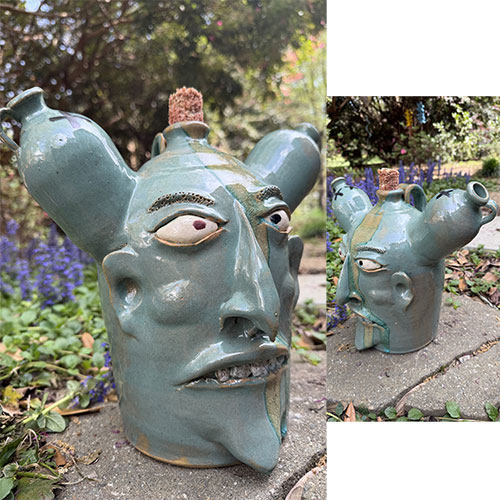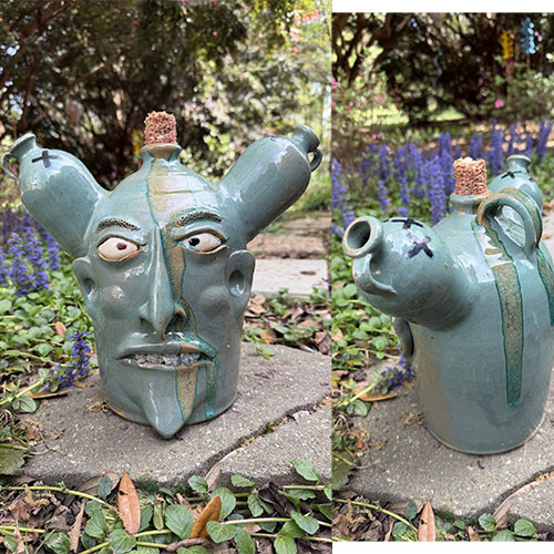 This large-scale double-spout face jug pushes the Southern face vessel tradition into bold, sculptural territory. Measuring approximately 12" tall and 13" wide and with a 6" base, the piece is defined by its horn-like opposing spouts, each marked with simple cross motifs that add a subtle symbolic edge.