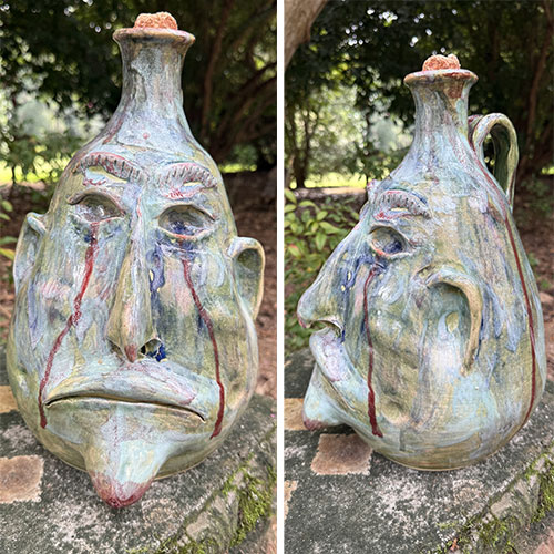 The rear handle and balanced proportions maintain its functional jug lineage, while the sculptural face elevates it firmly into the realm of contemporary Southern folk art. Rooted in the Gillsville pottery tradition yet distinctly individual, this piece embodies both narrative expression and strong visual presence.