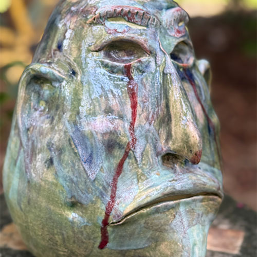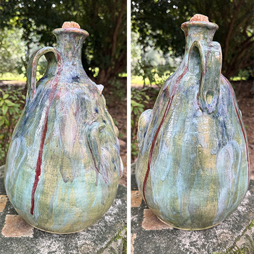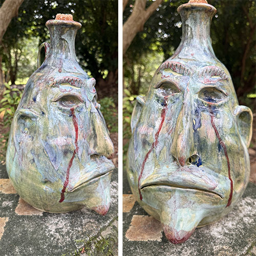 This face jug presents a striking, sculptural interpretation of the Southern face vessel tradition. The elongated form is anchored by a deeply expressive face, with exaggerated ears and a pronounced nose that extends into the vessel’s body, giving the piece both humor and gravity. A layered, variegated glaze in soft celadon greens, blues, and earthy tones flows organically across the surface, punctuated by dramatic iron-red runs that read as tear-like streaks descending from the eyes. The surface treatment enhances the emotional weight of the piece while highlighting the kiln’s influence, creating a painterly, almost weathered patina.