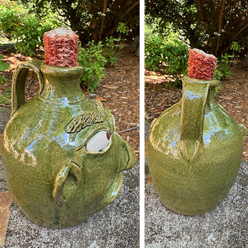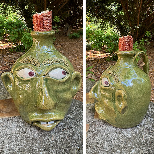 Wayne Hewell is a 5th generation potter who mixes his own glazes and works in a studio along a dirt path leading to a chicken house in Gillsville, GA. The Hewell family has been creating pottery for over 100 years. He uses wild clay from Georgia, fires in a wood-fired kiln, and uses Tobacco Spit or Alkaline glazes to create the greenish, runny surfaces on the jugs.