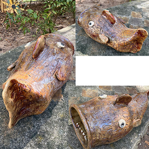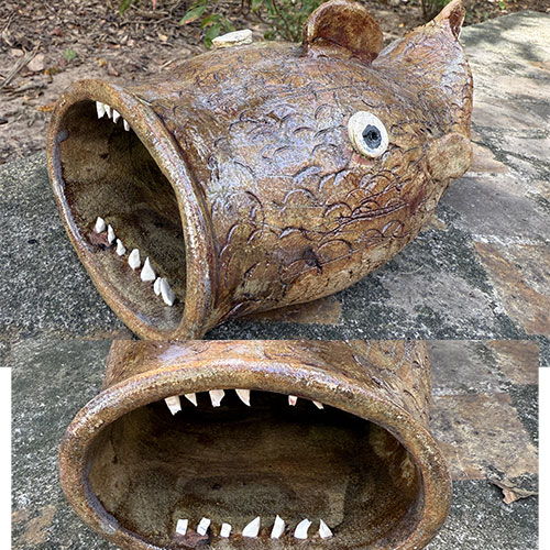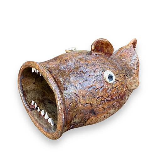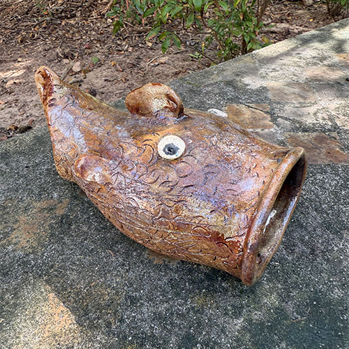 Wayne Hewell is a 5th generation potter who mixes his own glazes and works in a studio along a dirt path leading to a chicken house in Gillsville, GA. The Hewell family has been creating pottery for over 100 years. He uses wild clay from Georgia, fires in a wood-fired kiln, and uses Tobacco Spit or Alkaline glazes to create the greenish, runny surfaces on the jugs.