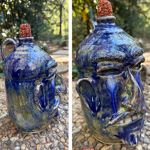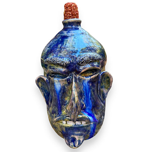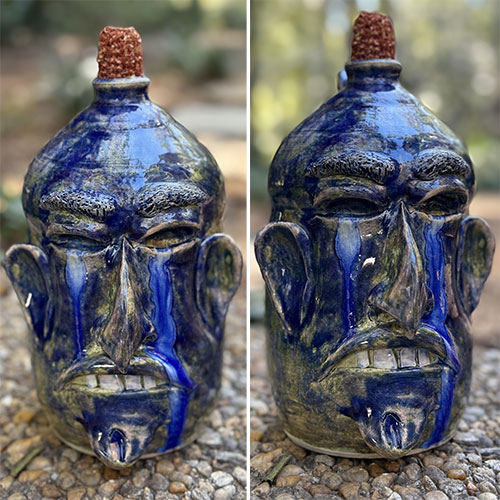 This face jug is the result of a departure Wayne took in choosing his glaze. Great runs. 9.5" tall with a 4.5" base.