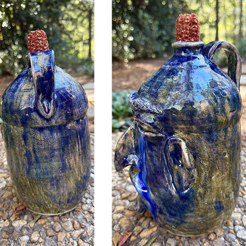 Wayne Hewell is a 5th generation potter who mixes his own glazes and works in a studio along a dirt path leading to a chicken house in Gillsville, GA. The Hewell family has been creating pottery for over 100 years. He uses wild clay from Georgia, fires in a wood-fired kiln, and uses Tobacco Spit or Alkaline glazes to create the greenish, runny surfaces on the jugs.