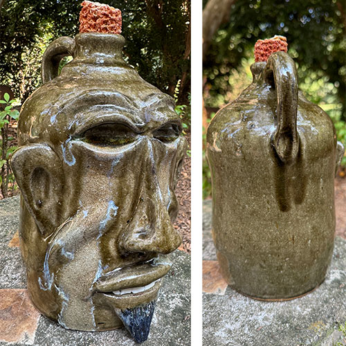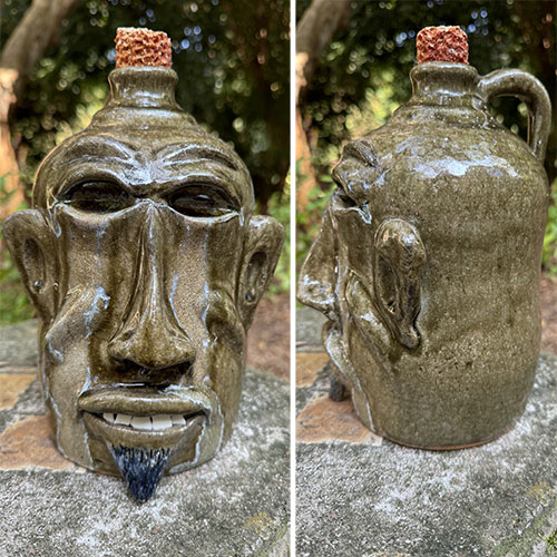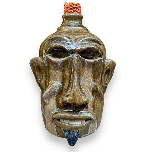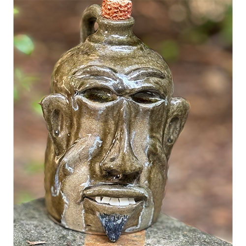 Wayne Hewell is a 5th generation potter who mixes his own glazes and works in a studio along a dirt path leading to a chicken house in Gillsville, GA. The Hewell family has been creating pottery for over 100 years. He uses wild clay from Georgia, fires in a wood-fired kiln, and uses Tobacco Spit or Alkaline glazes to create the greenish, runny surfaces on the jugs.