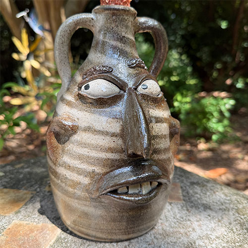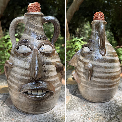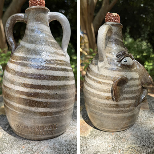 Wayne Hewell is a 5th generation potter who mixes his own glazes and works in a studio along a dirt path leading to a chicken house in Gillsville, GA. The Hewell family has been creating pottery for over 100 years. He uses wild clay from Georgia, fires in a wood-fired kiln, and uses Tobacco Spit or Alkaline glazes to create the greenish, runny surfaces on the jugs.