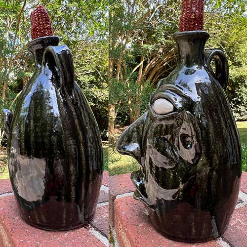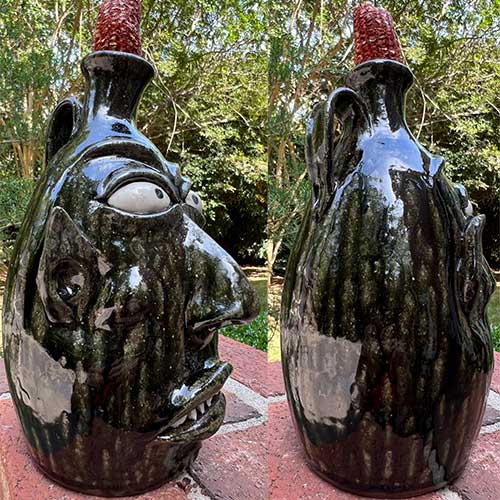 Wayne Hewell is a 5th generation potter who mixes his own glazes and works in a studio along a dirt path leading to a chicken house in Gillsville, GA. The Hewell family has been creating pottery for over 100 years. He uses wild clay from Georgia, fires in a wood-fired kiln, and uses Tobacco Spit or Alkaline glazes to create the greenish, runny surfaces on the jugs.