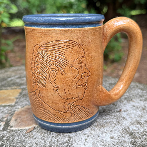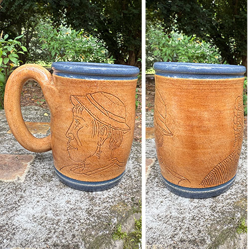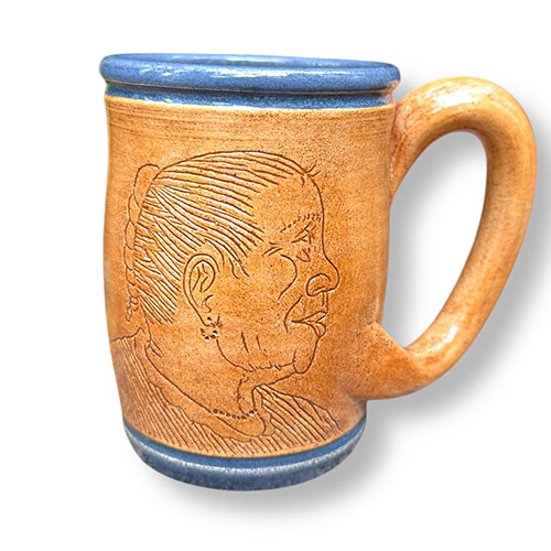 This is etched faces mug by Winton and Rosa. Meaures 4.5" tall with a 3" top opening.