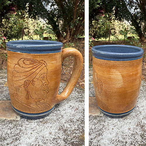 This face mug is 4.75" tall with a 2.75" base and 3.25" top opening..