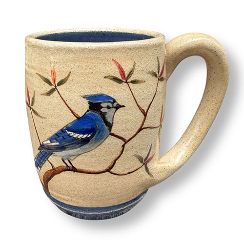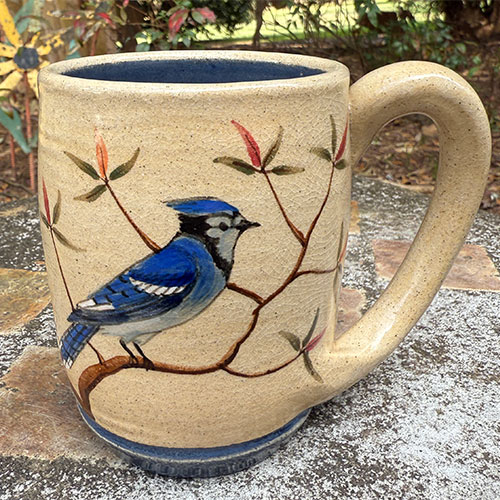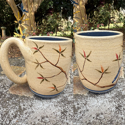 This mug is 4.25" tall, 2.5" base and 3" top opening. Mugs on average hold 12 oz with room to spare. The Eugenes create work that is functional, such as this mug. Microwave and dishwasher safe.