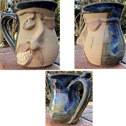 Zane Kuhle "Zaney" Face Mugs are functional stoneware pottery in a whimsical Folk Art form. Each face is created by hand, and no 2 are exactly alike. They have a bright blue inside and runny blues layered on the outside. These are all limited production original art. All are unique and slightly different. Variations may include varying shades in the moustache, shapes of the noses, the runs in the glazes, sizes and shapes of the mug. This all adds to the individuality of each piece.