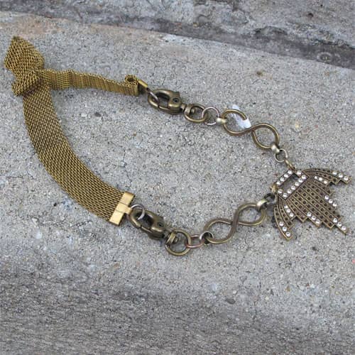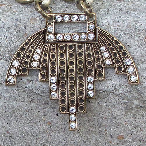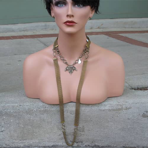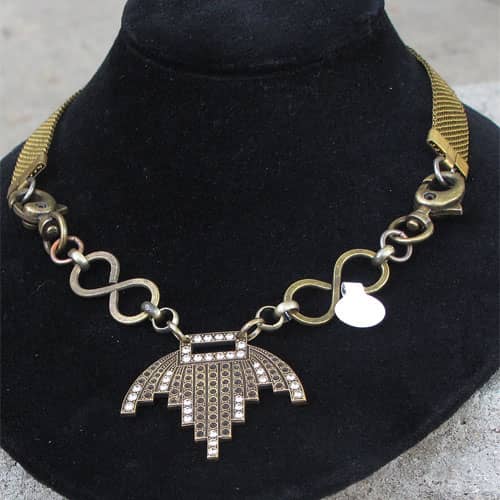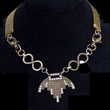 Parts from the past reassembled for today. You never know what Angel Court will use in assembling a necklace. Is it part of a vintage piece of jewelry, or is it from a belt - or even a shoe? I'll leave its heritage up to you and your imagination. The crystal studded centerpiece is 1.75" wide and 1.75" long. The mesh chain is 10/16" wide. Necklace length is 16". The unique construction allows you to unhook the center linked chain and pendant and move it to another necklace if you have one that will accept the addition.