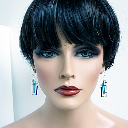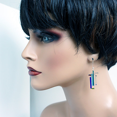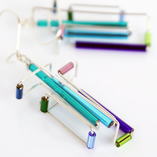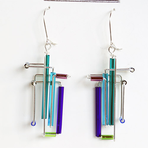Barbie Levy works from her studio in Owings Mills, MD. Her "Barb Wire" series is created from sterling silver and colorful glass tubing. The ear wires hook closed. They look like little pieces of modern art for your ears. Light weight.
