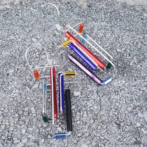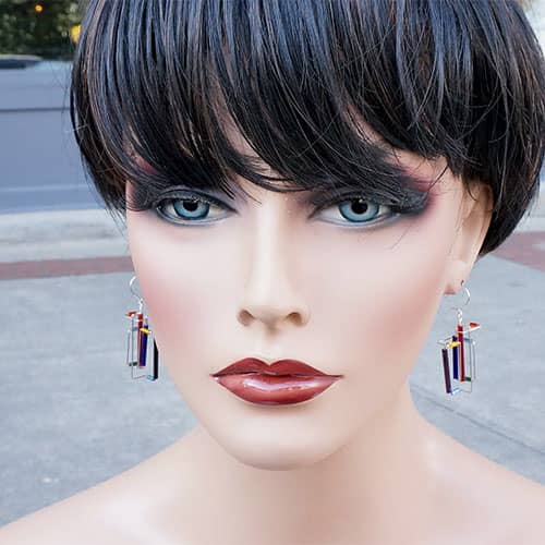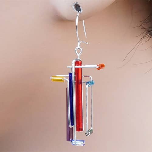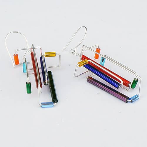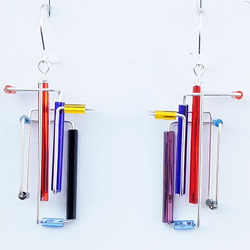 Barbie Levy works from her studio in Owings Mills, MD. Her "Barb Wire" series is created from sterling silver and colorful glass tubing. The ear wires hook closed. They look like little pieces of modern art for your ears. Light weight.