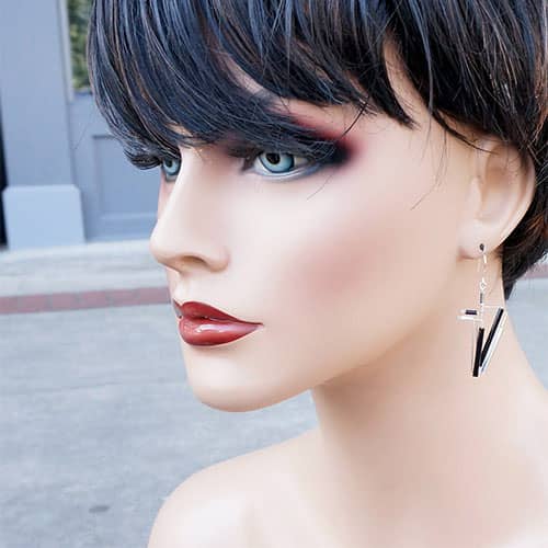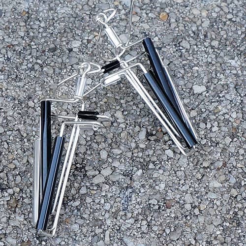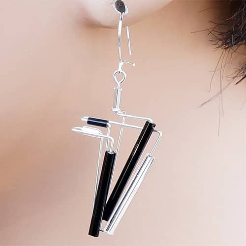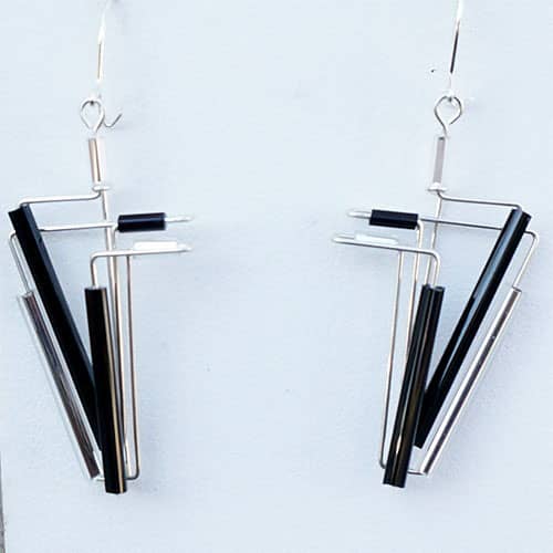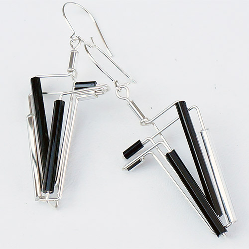 Barbie Levy works from her studio in Owings Mills, MD. Her "Barb Wire" series is created from sterling silver and colorful glass tubing. The ear wires hook closed. They look like little pieces of modern art for your ears. Light weight.