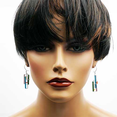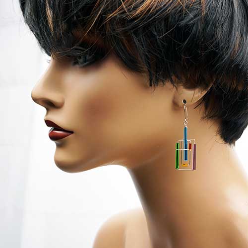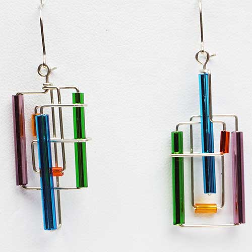 Barbie Levy works from her studio in Owings Mills, MD. Her "Barb Wire" series is created from sterling silver and colorful glass tubing. The ear wires hook closed. They look like little pieces of modern art for your ears. Light weight.