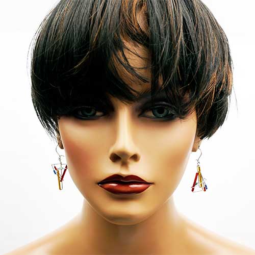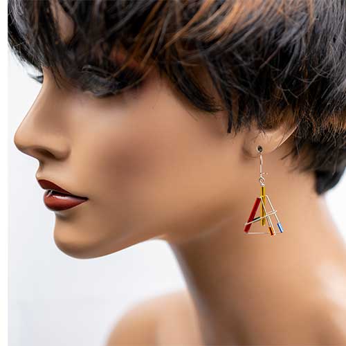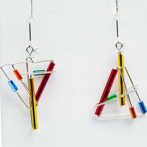 Barbie Levy works from her studio in Owings Mills, MD. Her "Barb Wire" series is created from sterling silver and colorful glass tubing. The ear wires hook closed. They look like little pieces of modern art for your ears. Light weight.