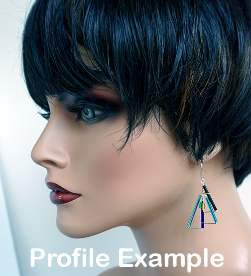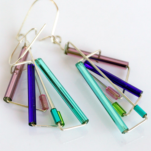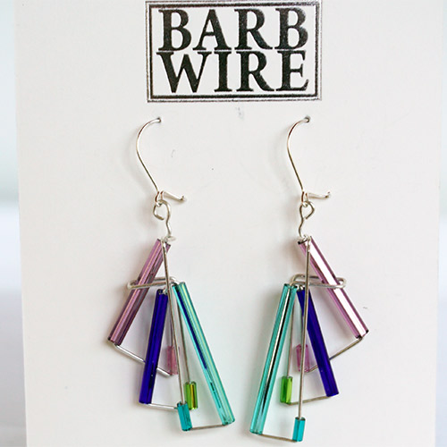 Barbie Levy works from her studio in Owings Mills, MD. Her "Barb Wire" series is created from sterling silver and colorful glass tubing. The ear wires hook closed. They look like little pieces of modern art for your ears. Light weight.