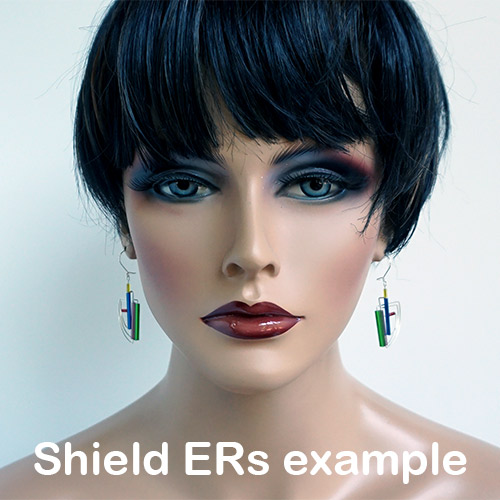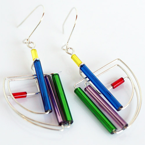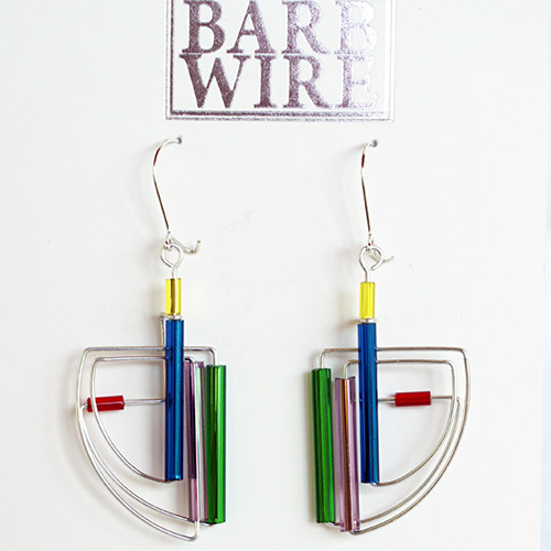 Barbie Levy works from her studio in Owings Mills, MD. Her "Barb Wire" series is created from sterling silver and colorful glass tubing. The ear wires hook closed. They look like little pieces of modern art for your ears. Light weight.