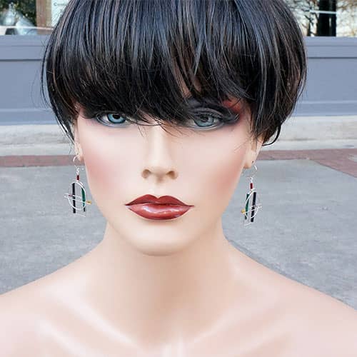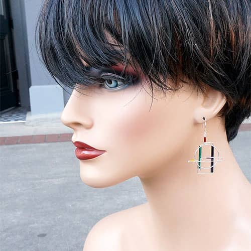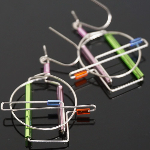 Barbie Levy works from her studio in Owings Mills, MD. Her "Barb Wire" series is created from sterling silver and colorful glass tubing. The ear wires hook closed. They look like little pieces of modern art for your ears. Light weight.