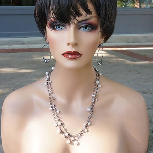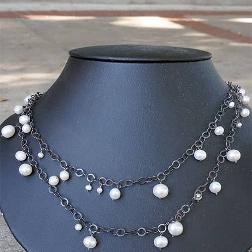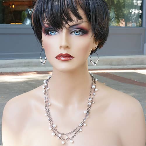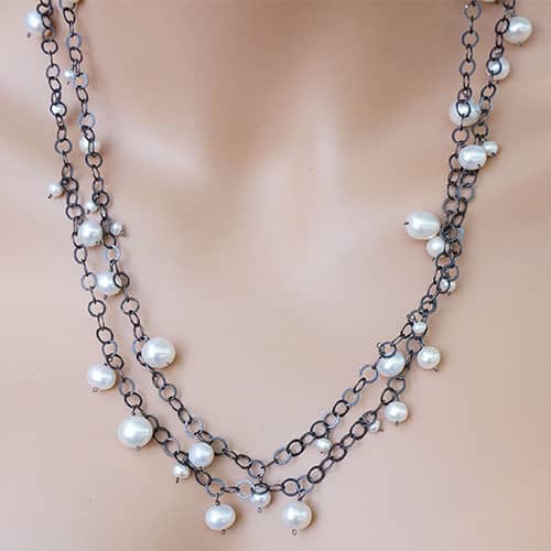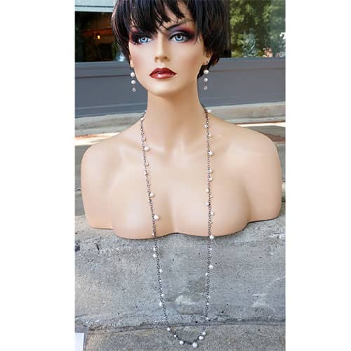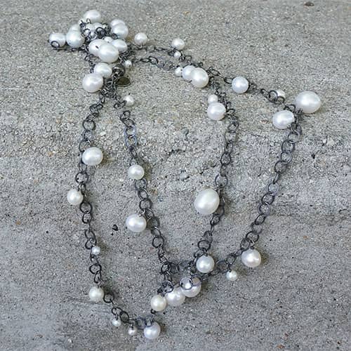 A nice and airy necklace with a lot of pressence. 16" long. Closes with a magnetic clasp. Comprised of a collection of pearl sizes on an airy chain. 45" long. Wear as a single or double. Please see photos for an idea of how it falls when worn. You receive the necklace pictured.