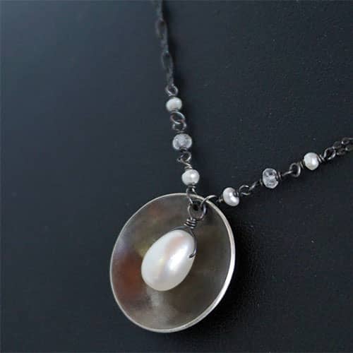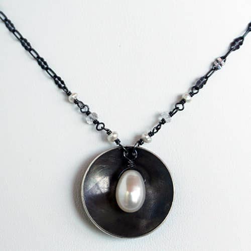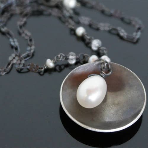 A subdued and graceful necklace, 17" long plus additional 2" extender making it adjustable. Closes with a lobster claw. Oxidized silver concave disc is .75" diameter. The teardrop shaped pearl rests insided. Please see photos for an idea of how it falls when worn. You receive the necklace pictured.