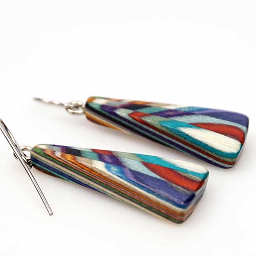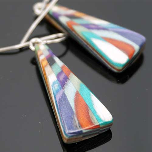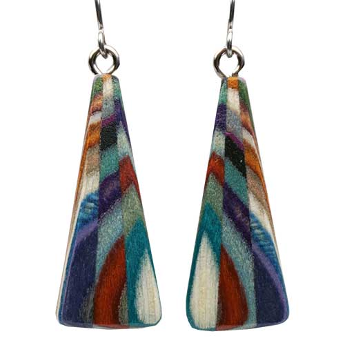 Buzz Coren's Featherwood jewelry starts from laminating a broad palette of colored hardwood veneer, most of which he pressure dyes himself into stacks of 300 layers or so. These laminations are carefully cut into small shapes. The shapes are then turned into jewelry by carefully cutting and smoothing them with very close work on both band saw and sanders. Each piece of jewelry receives several coats of a durable finish to provide worry free wear for years to come.
