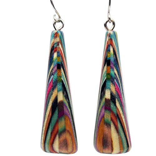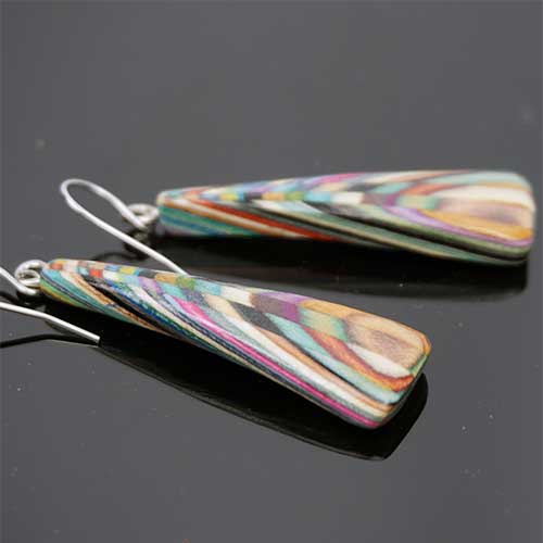 Buzz Coren's Featherwood jewelry starts from laminating a broad palette of colored hardwood veneer, most of which he pressure dyes himself into stacks of 300 layers or so. These laminations are carefully cut into small shapes. The shapes are then turned into jewelry by carefully cutting and smoothing them with very close work on both band saw and sanders. Each piece of jewelry receives several coats of a durable finish to provide worry free wear for years to come.