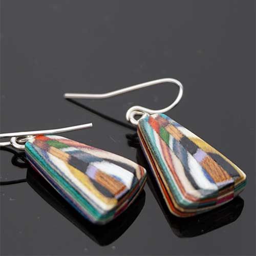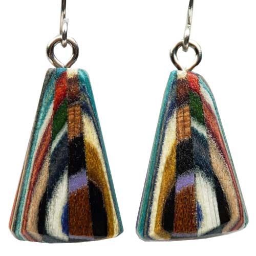 Buzz Coren's Featherwood jewelry starts from laminating a broad palette of colored hardwood veneer, most of which he pressure dyes himself into stacks of 300 layers or so. These laminations are carefully cut into small shapes. The shapes are then turned into jewelry by carefully cutting and smoothing them with very close work on both band saw and sanders. Each piece of jewelry receives several coats of a durable finish to provide worry free wear for years to come.