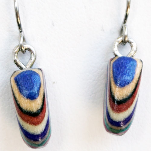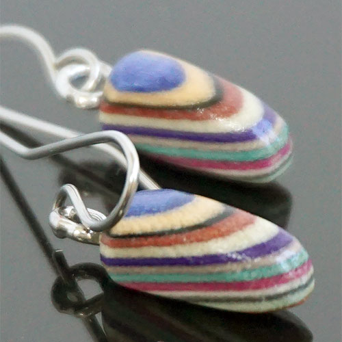 Buzz Coren's Featherwood jewelry starts from laminating a broad palette of colored hardwood veneer, most of which he pressure dyes himself into stacks of 300 layers or so. These laminations are carefully cut into small shapes. The shapes are then turned into jewelry by carefully cutting and smoothing them with very close work on both band saw and sanders. Each piece of jewelry receives several coats of a durable finish to provide worry free wear for years to come.