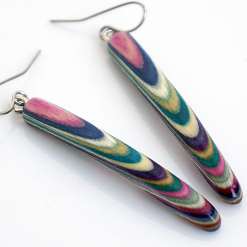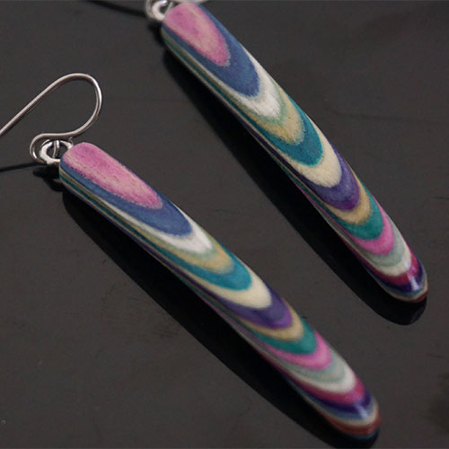 Buzz Coren's Featherwood jewelry starts from laminating a broad palette of colored hardwood veneer, most of which he pressure dyes himself into stacks of 300 layers or so. These laminations are carefully cut into small shapes. The shapes are then turned into jewelry by carefully cutting and smoothing them with very close work on both band saw and sanders. Each piece of jewelry receives several coats of a durable finish to provide worry free wear for years to come.