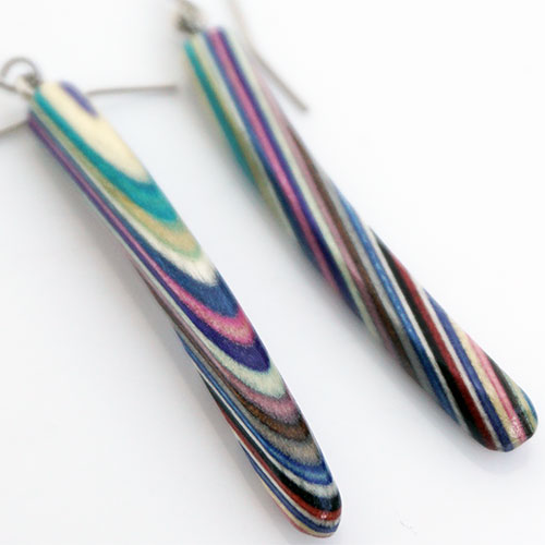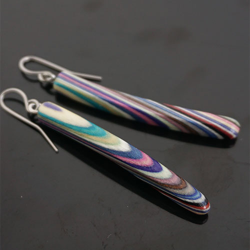 Buzz Coren's Featherwood jewelry starts from laminating a broad palette of colored hardwood veneer, most of which he pressure dyes himself into stacks of 300 layers or so. These laminations are carefully cut into small shapes. The shapes are then turned into jewelry by carefully cutting and smoothing them with very close work on both band saw and sanders. Each piece of jewelry receives several coats of a durable finish to provide worry free wear for years to come.