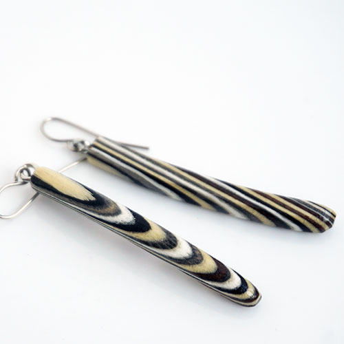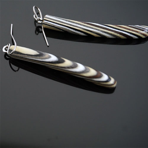 Buzz Coren's Featherwood jewelry starts from laminating a broad palette of colored hardwood veneer, most of which he pressure dyes himself into stacks of 300 layers or so. These laminations are carefully cut into small shapes. The shapes are then turned into jewelry by carefully cutting and smoothing them with very close work on both band saw and sanders. Each piece of jewelry receives several coats of a durable finish to provide worry free wear for years to come.