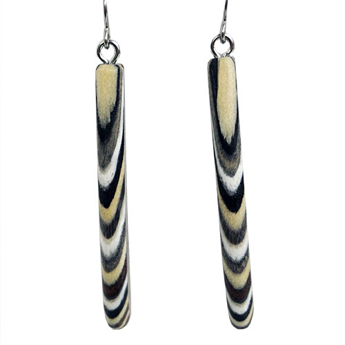 Featherwood Skinny Longs are 2.25" long measured from the center of the ear wire curve. The wood is 1.75" long and about .25" wide. Ear wires are surgical steel. They really are feather light! You receive the earrings shown in the detail photos.