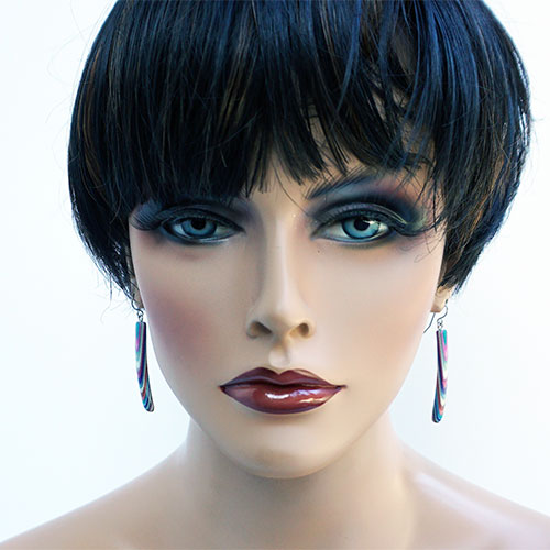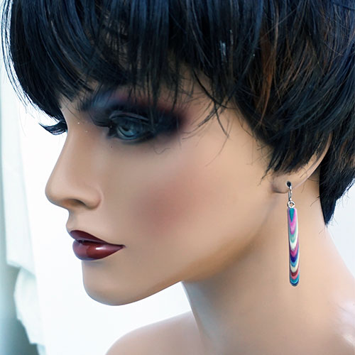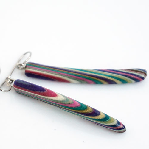 Buzz Coren's Featherwood jewelry starts from laminating a broad palette of colored hardwood veneer, most of which he pressure dyes himself into stacks of 300 layers or so. These laminations are carefully cut into small shapes. The shapes are then turned into jewelry by carefully cutting and smoothing them with very close work on both band saw and sanders. Each piece of jewelry receives several coats of a durable finish to provide worry free wear for years to come.
