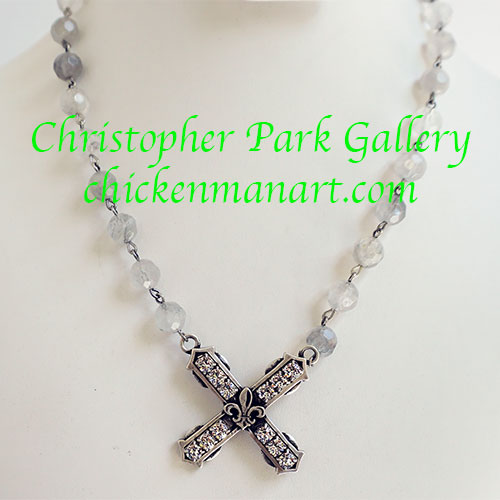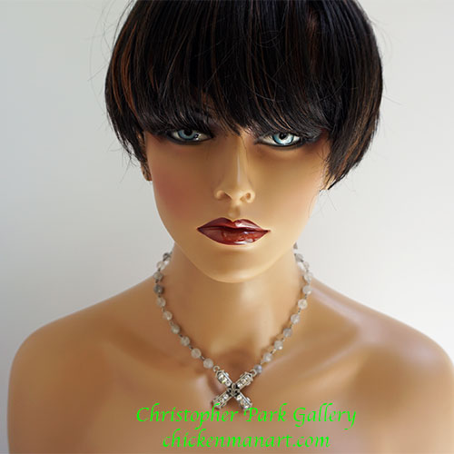This necklace features 17” of faceted Cloudy Quartz with silver wire and our exclusive Swarovski French kiss pendant. Absolutely beautiful all by itself or layered with our other designs. • Strand Length: Short, 17” • Stone Size: 8 mm • Sterling Silver plated
