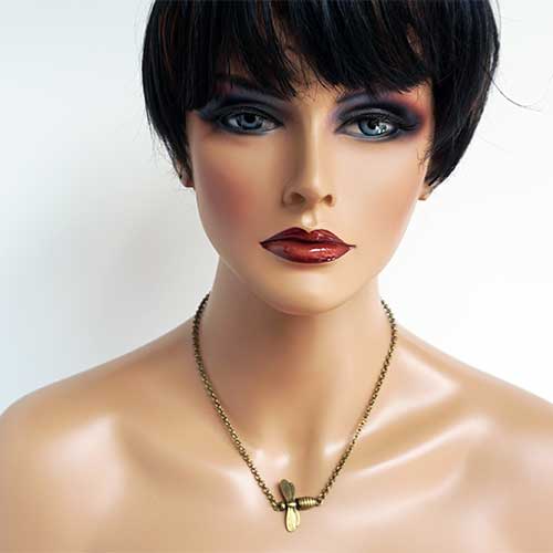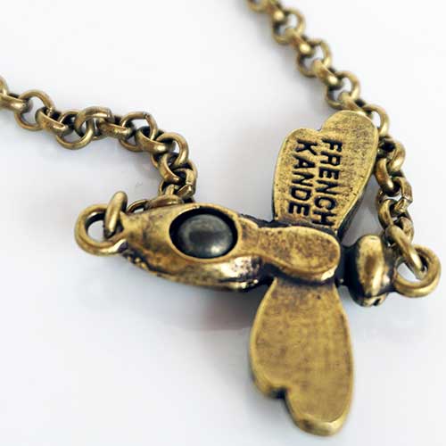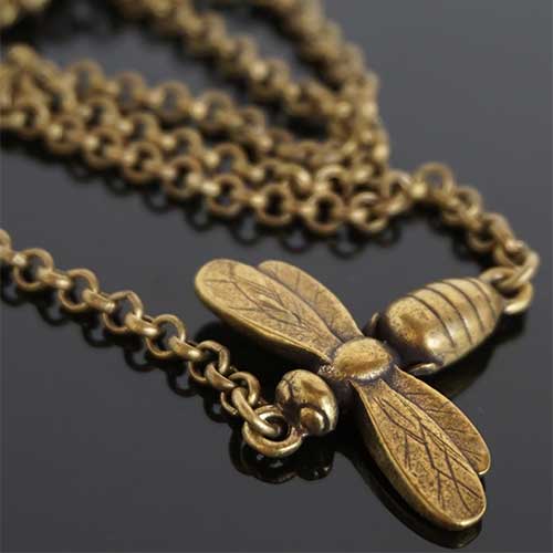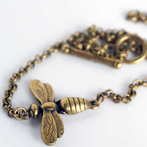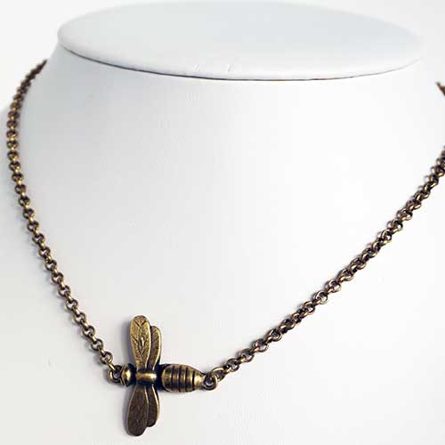 This necklace features 17” of FK rolo chain with miel pendant. Brass Plated. Bee is 1" long and 1.25" across wing span. Pyrite bead on the back side.