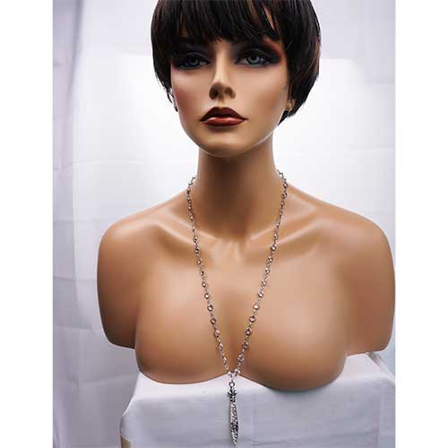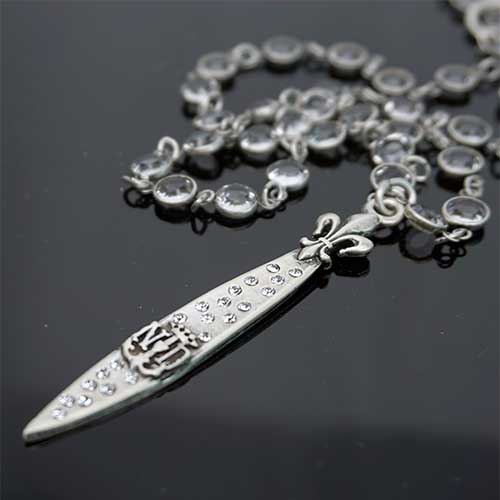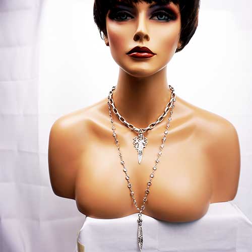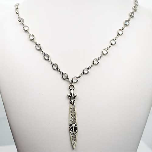 This necklace features 28” of silver crystal chanel set Swarovski (7 mm) and FK Swarovski Pointu pendant. Absolutely beautiful all by itself or layered with our other designs. Swarovski studded Pointu pendant is 2.75" long and .25" wide.