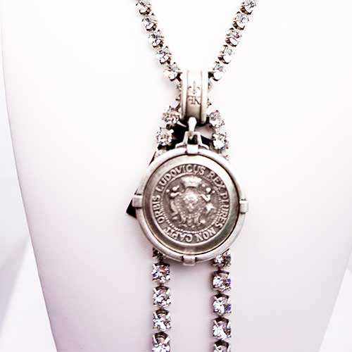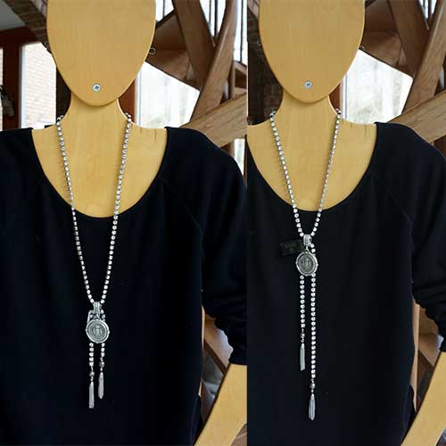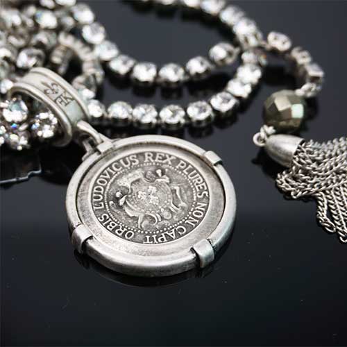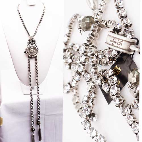 This necklace features 44 adjustable inches of FK's silver Swarovski cupchain chain, exclusive FK Oval bail, Expo medallion, Pyrite dangle and tassels. Absolutely beautiful all by itself or layered with our other designs. The exciting news is that it is completely adjustable anywhere from 14-42” making it one of the most versatile pieces of jewelry in your collection. Tassels are 2.5" long. Medallion is 1.5" diameter.