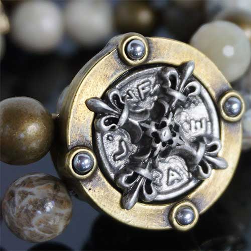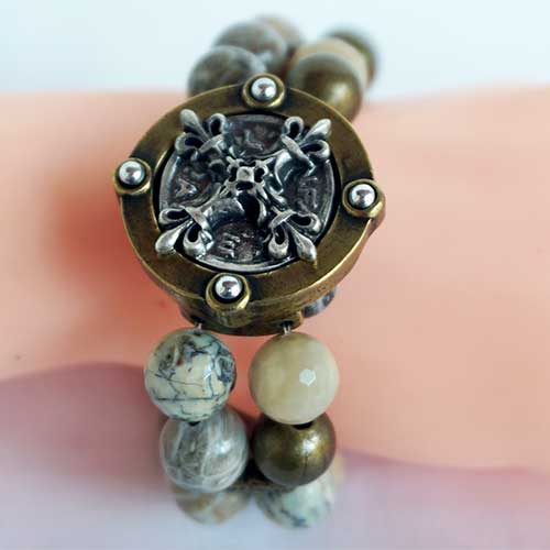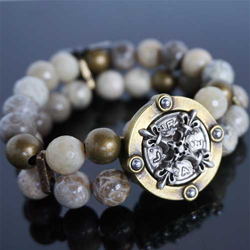 This bracelet features two strands of FK hand-curated Cafe Au Lait mix, the exclusive FK demi cab bezel and Mini X medallion. Absolutely beautiful all by itself or paired with our other designs. Bracelet Length: 7 3/4” • Stone Size: 10 mm • Stone Mix Includes: Fossilized Coral, African Opal, Brass Metal Bead • Sterling Silver and Brass Plated • Cabochon Color: Silver