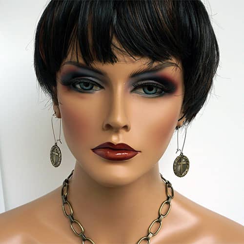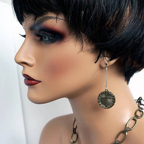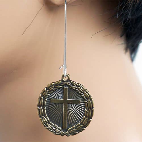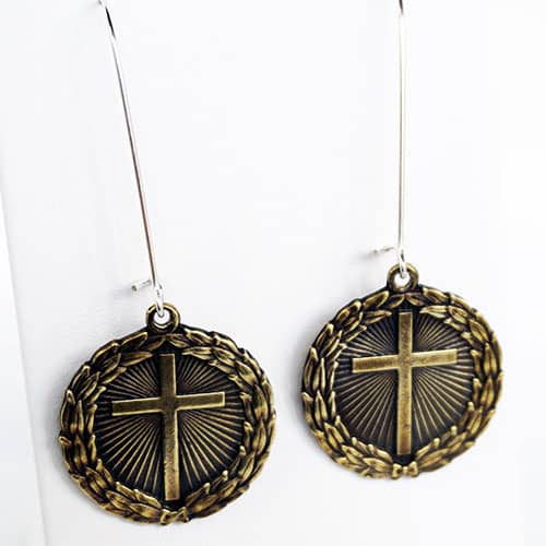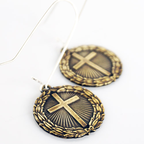 Antiqued brass clad measuring 2.25" long, measured from the center of the ear wire curve. Medallion is almost 1" diameter. Sterling ear wires.