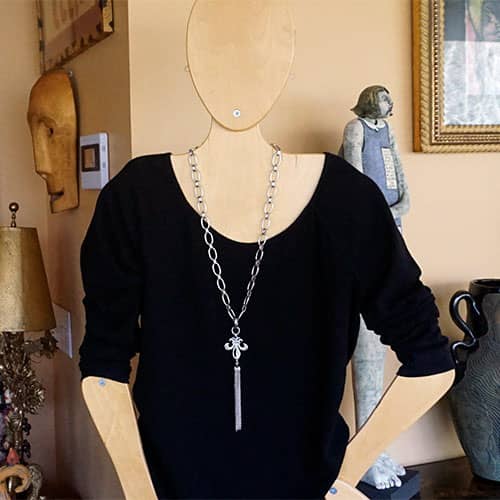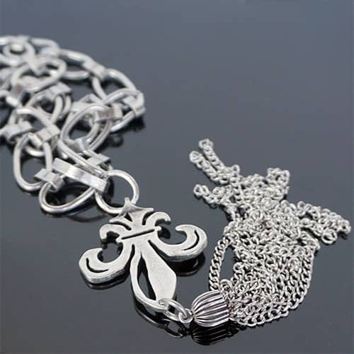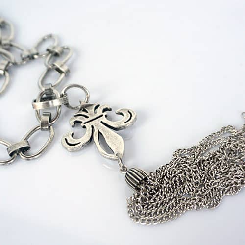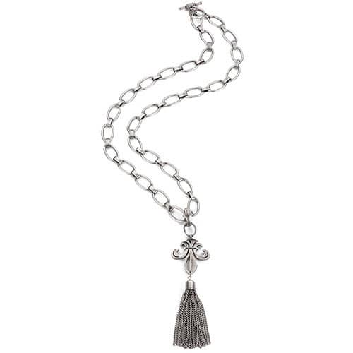 This necklace features 30" of bold, elongated bubble chain with French Kande's Grande Fleur pendant and tassel. Absolutely beautiful by itself or layered with other designs. Sterling Silver Plated. Closes with toggle. Not adjustable. Drop is 5.5" long. Tassel is 3.25" long. Fleur is 1.75" long and 1.5" wide.