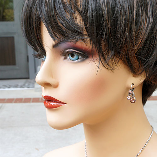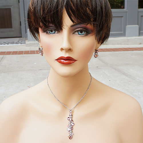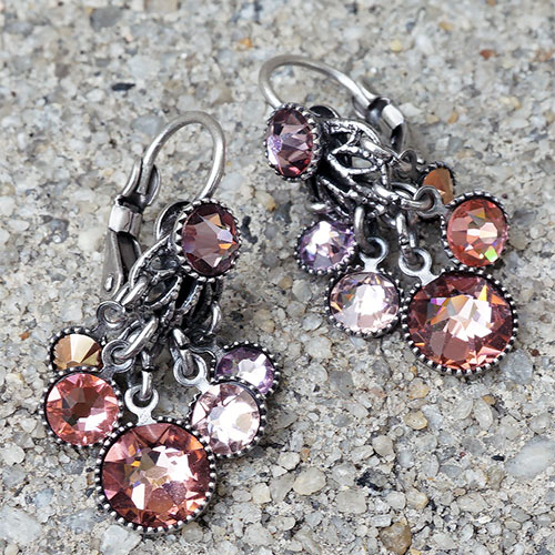 Dangling Waterfalls beige and pink crystal earrings with antiqued silver tone. Measures 1" long.