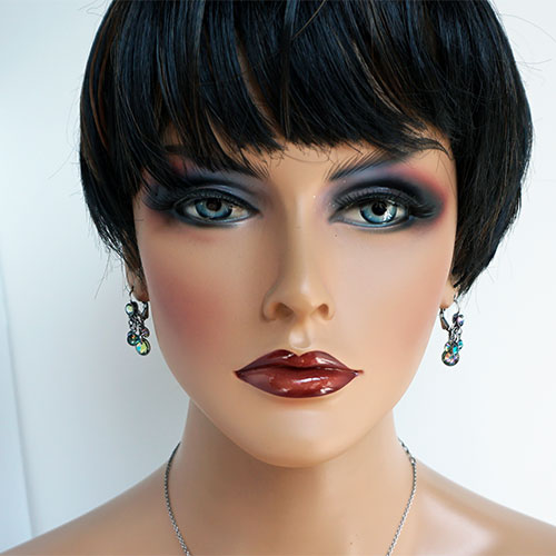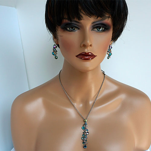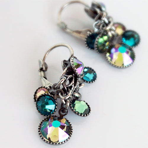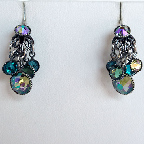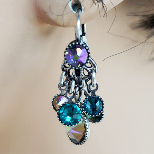 Dangling Waterfalls green and lilac crystal earrings with antiqued silver tone. Measures 1.75" long from the center of the earwire curve.