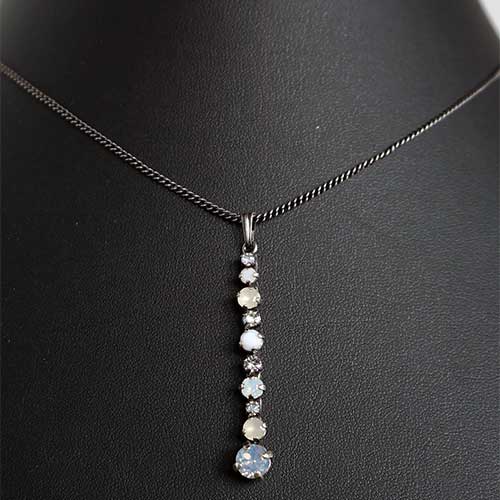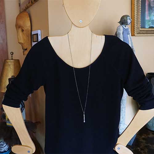 I don't know. I would certainly be comfortable wearing this with jean capris and a white linen top. But that's just me. It has a kind of industrial feel because of the antiqued silver tones. Measures 35" long with an additional 3" extender. The crystal assemblage is 2" long.